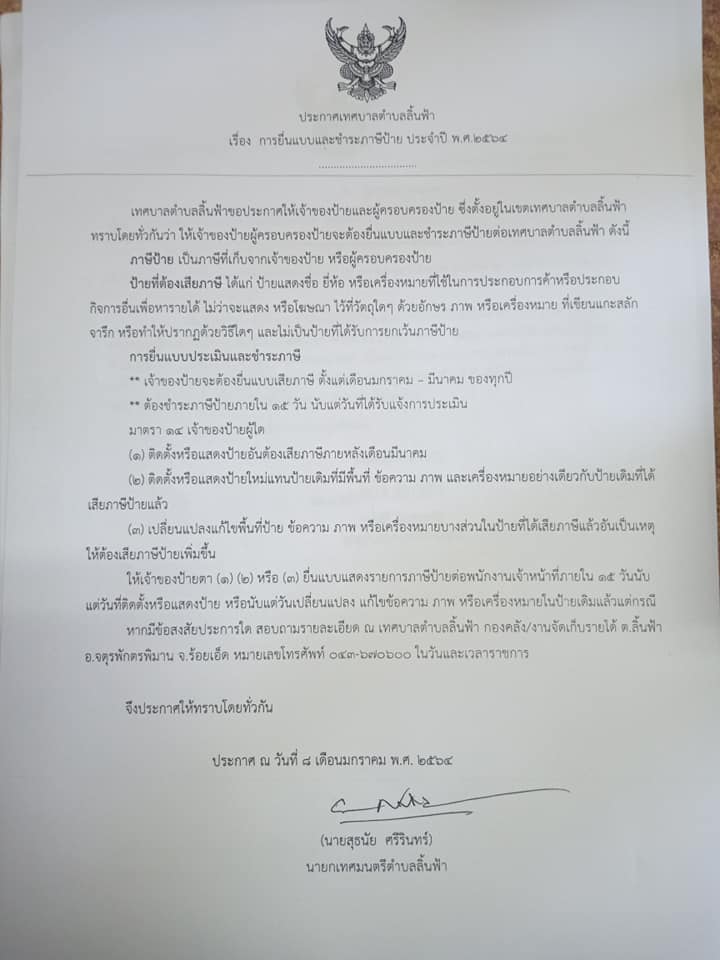 ประชาสัมพันธ์ การยื่นแบบและชำระภาษีป้ายประจำปี 2564