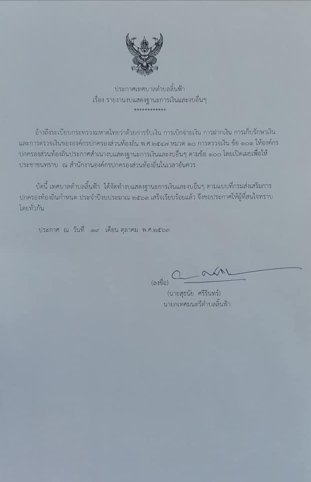 ประกาศเทศบาลตำบลลิ้นฟ้า เรื่อง รายงานงบแสดงฐานะการเงินและงบอื่น ๆ