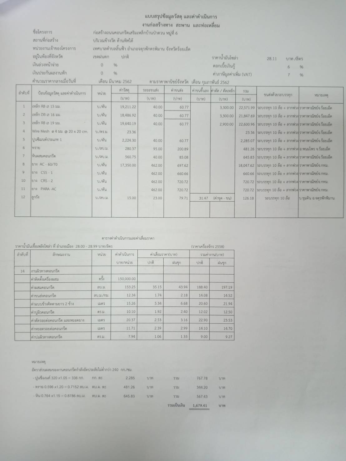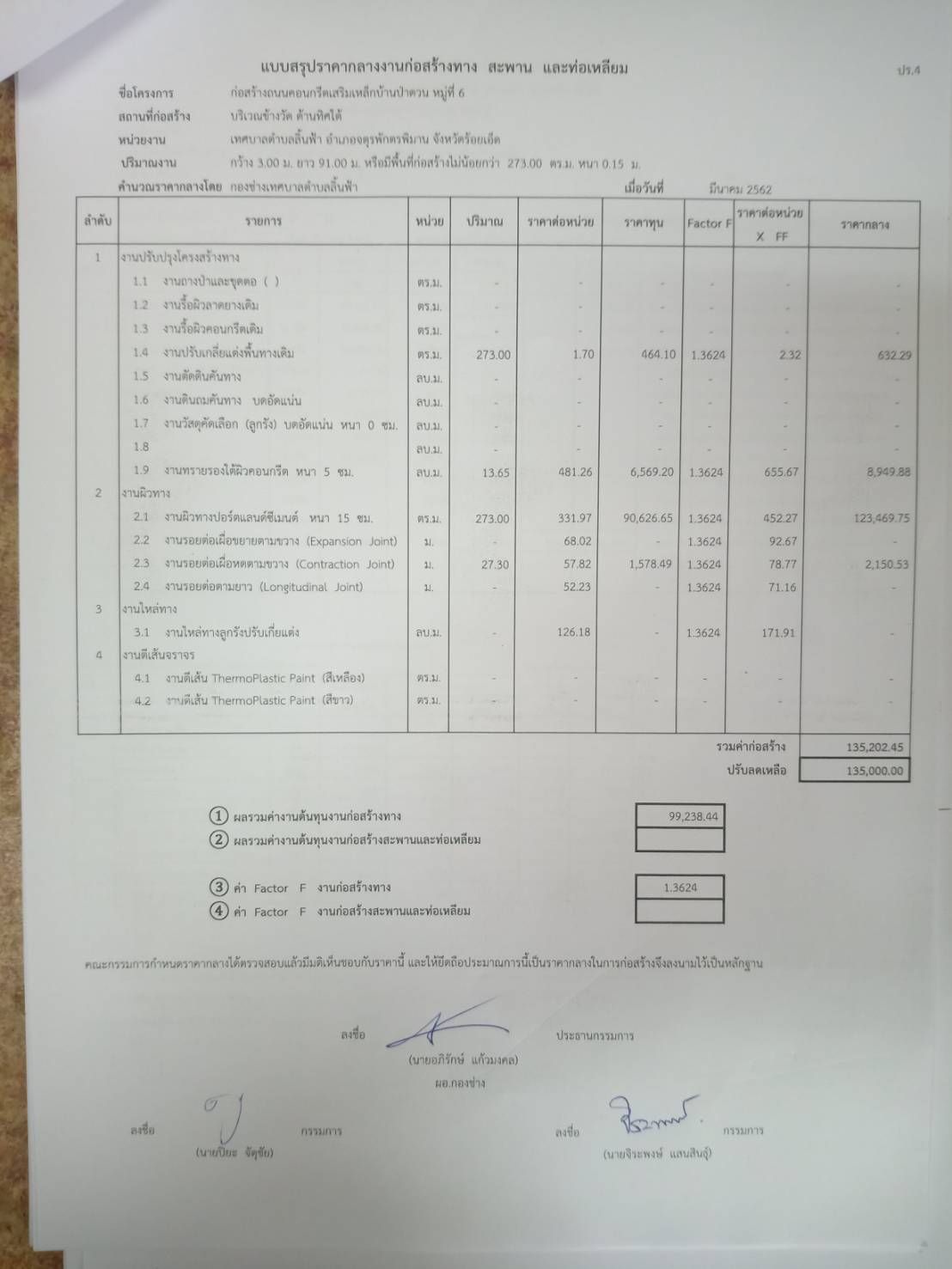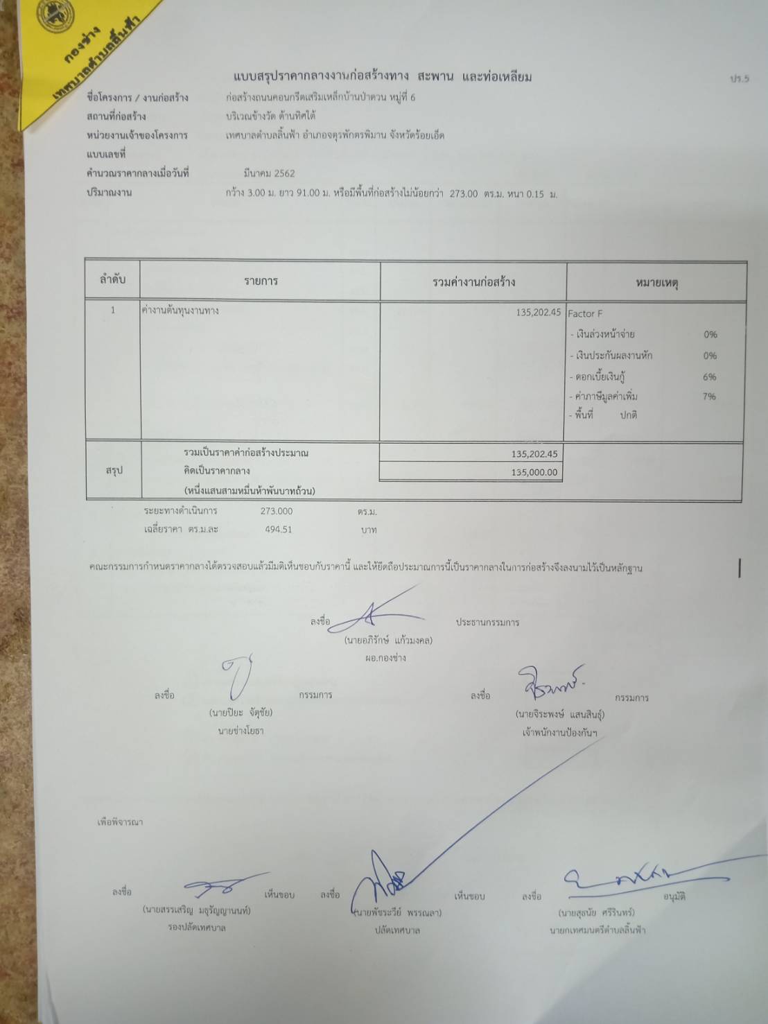 ประกาศราคากลางโครงการก่อสร้างถนนคอนกรีตเสริมเหล็กบ้านป่าดวน ม.6 บริเวณวัด ด้านทิศใต้ กว้าง 3.๐๐ ม. ระยะทาง 91.๐๐ ม. หรือมีพื้นที่ก่อสร้างไม่น้อยกว่า 273.๐๐ ตร.ม. หนา๐.๑๕ ม.พร้อมลงหินลูกรังไหล่ทางเฉลี่ยข้างละ ๐.๕๐ เมตร ตามแบบเทศบาลตำบลลิ้นฟ้ากำหนด งบประมาณ 145,000 บาท (หนึ่งแสนสี่หมื่นห้าพันบาทถ้วน)